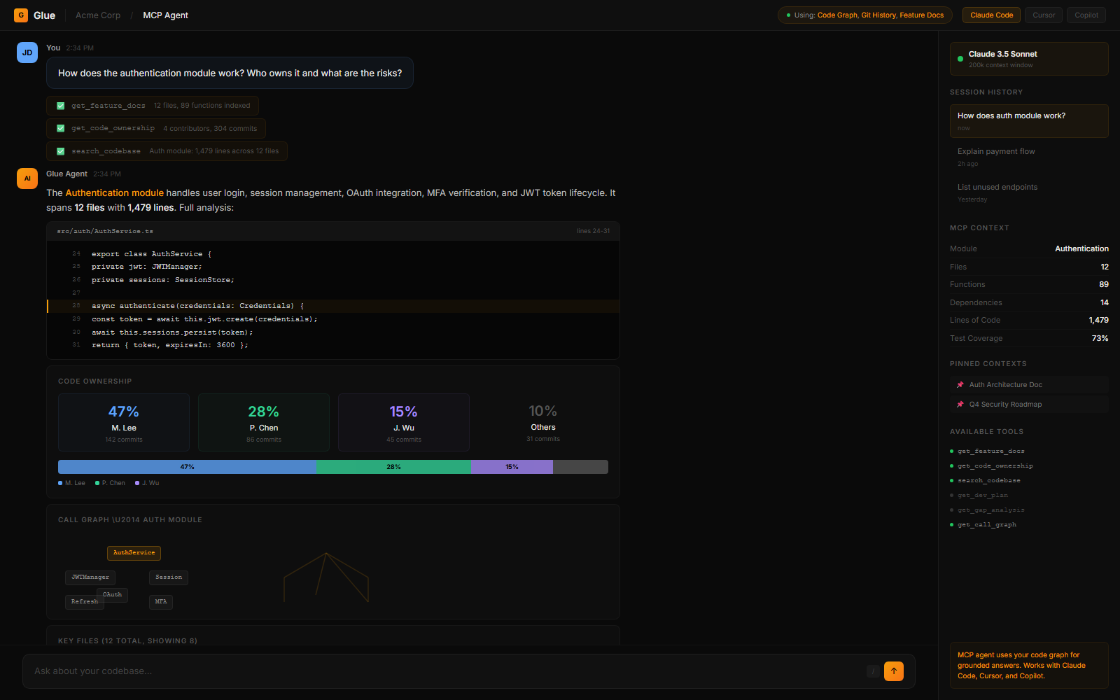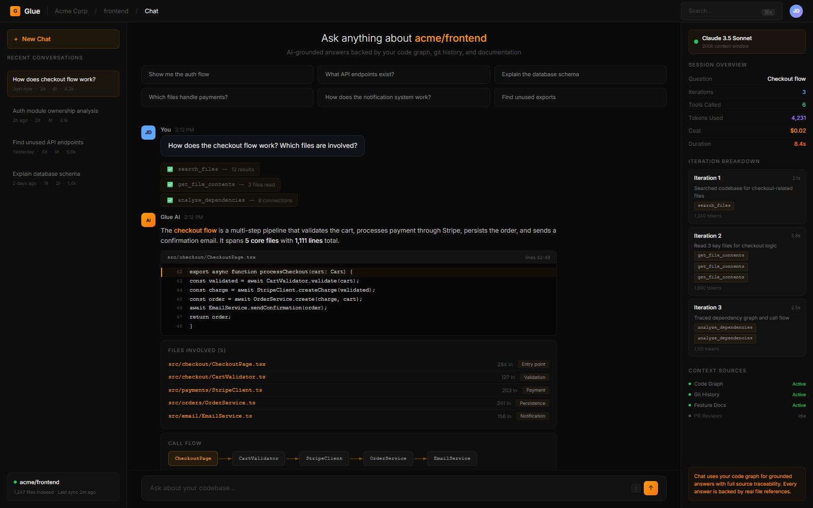 Every repo you connect deepens the graph. Every question refines the model. Every team member who joins adds context. Glue builds a compound understanding of your product that no individual on your team has -- and no competitor can replicate.